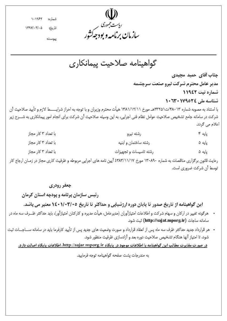 اخذ رتبه 4 نیرو، رتبه 5 ساختمان و ابنیه، رتبه 5 تاسیسات و تجهیزات صلاحیت پیمانکاری ساجات معاونت برنامه ریزی و نظارت راهبردی ریاست جمهوری